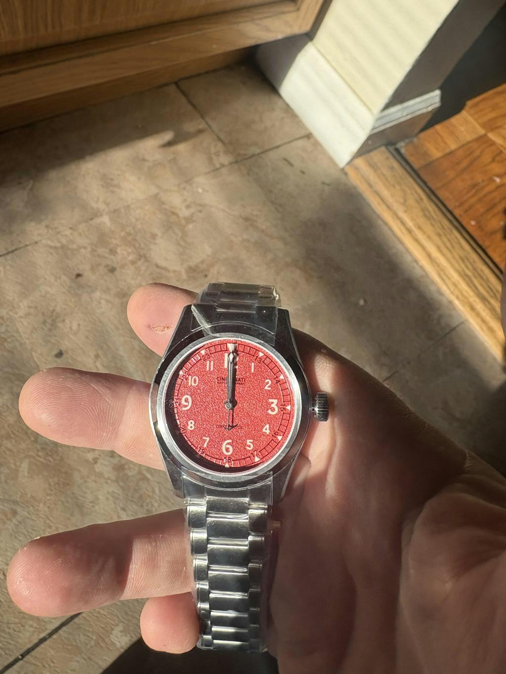 Red dial has excellent quality and grainy texture that pops in light; highly legible with strong lume for low-light use.